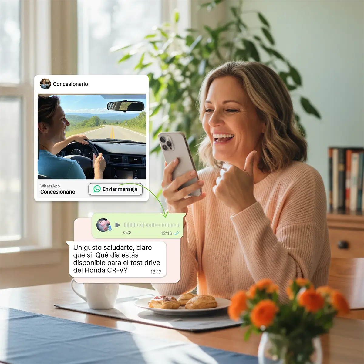 Crea pauta que lleve directamente a WhatsApp, y deja que un AI Agent multimodal atienda y califique al instante. Así, tus leads no se enfrían y tu equipo de ventas recibe contactos listos para cerrar.